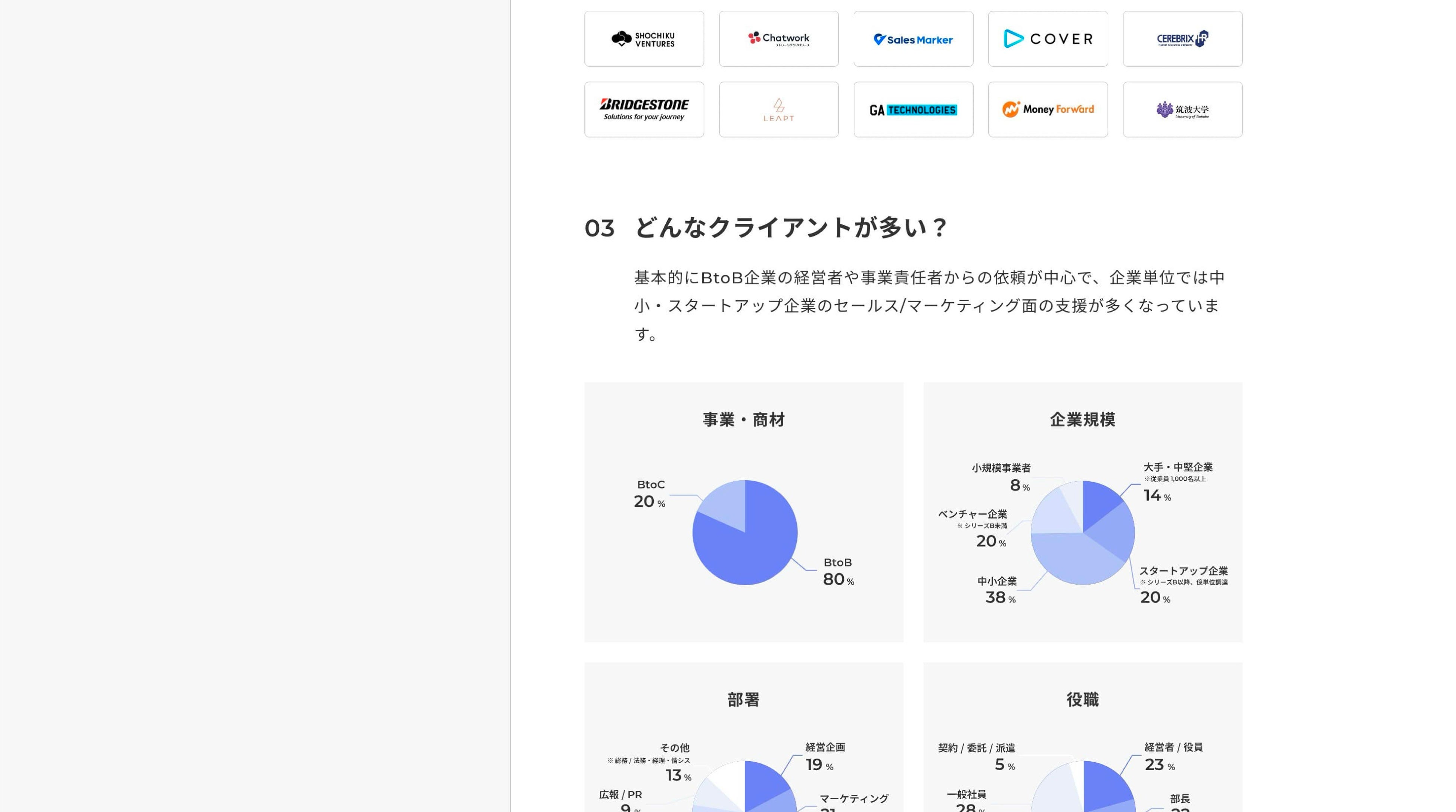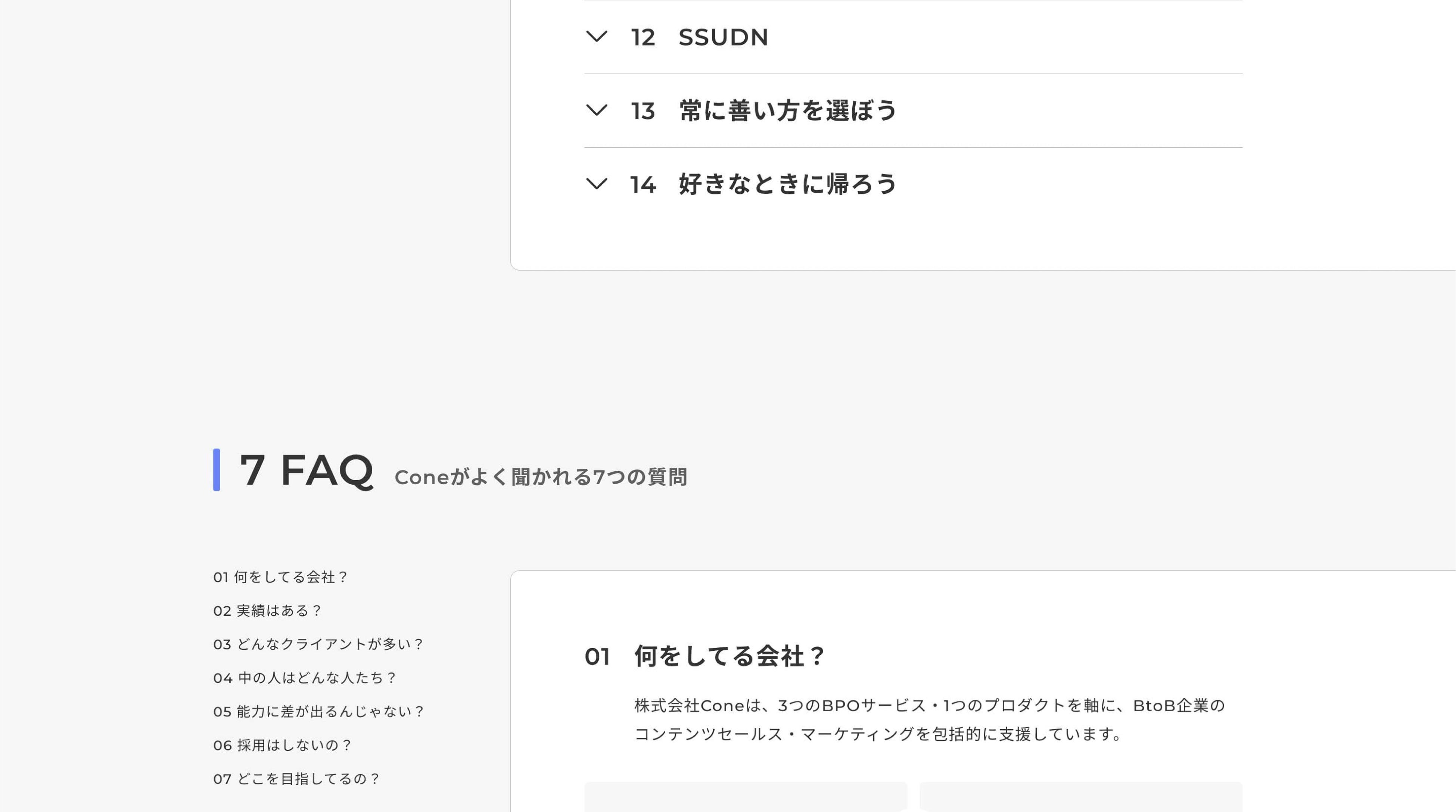 次に「Coneがよく聞かれる7つの質問」という形で「サービス」「採用情報」などの要素に触れています。一見さんが気になる項目に回答して、詳しくは別のページに誘導する構成となっています。