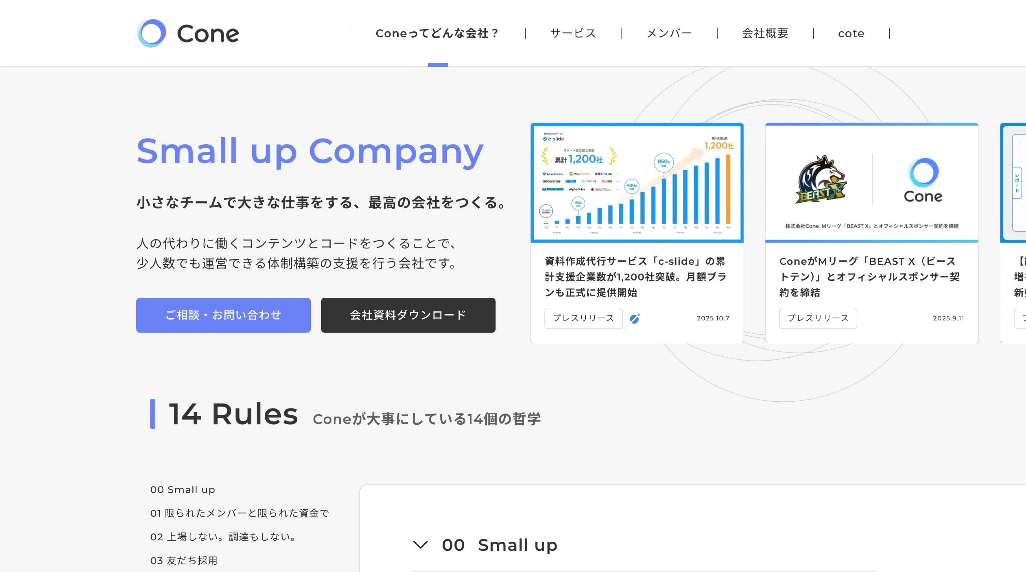 これまでのConeのコーポレートサイトは、自社の知名度が限りなく低いにも関わらず、大手企業のような「サービス」「お知らせ」「採用情報」といった要素を並べた構成のサイトとなっていました。