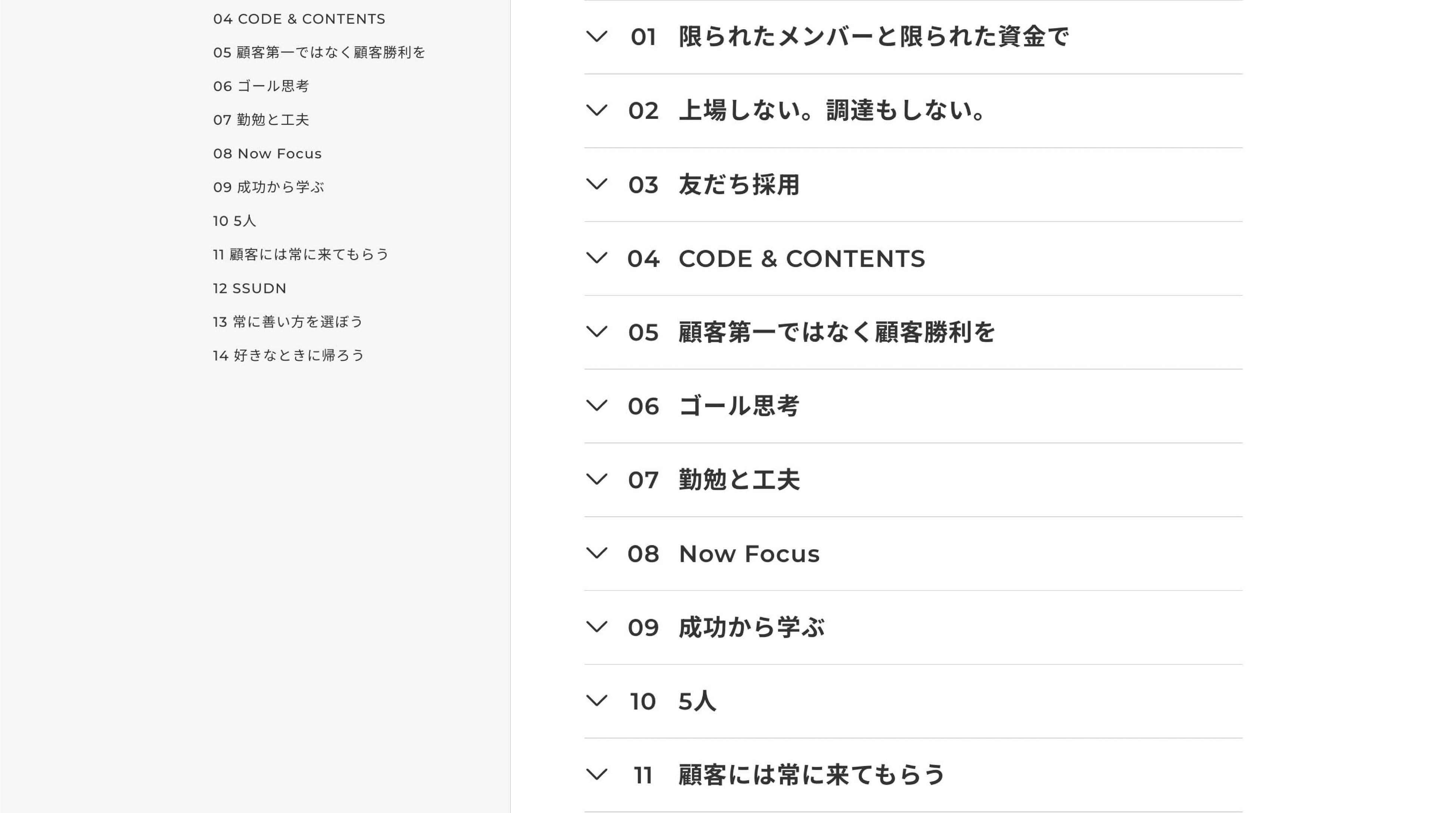 まず、どんな会社なのかわかりやすくするために「Coneが大事にしている14個の哲学」を並べています。
