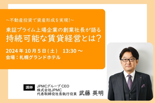 株式会社JPMC“持続可能な賃貸経営”を追求する株式会社JPMC(本社:東京都千代田区、代表取締役 社長執行役員:武藤 英明、以下「JPMC」)は、10月5日(土)に賃貸住宅オーナー向けの経営セミナー「~不動産投資で資産形成を実現!~東証プライム上場企業の創業社長が語る 持続可能な賃貸経営とは?」を札幌市で開催いたします。