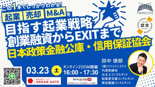起業からM&A売却までの資金調達は日本政策金融公庫と信用保証協会の創業融資から起業からM&A売却までの資金調達は日本政策金融公庫と信用保証協会の創業融資から2024年3月23日(土)16:00開催