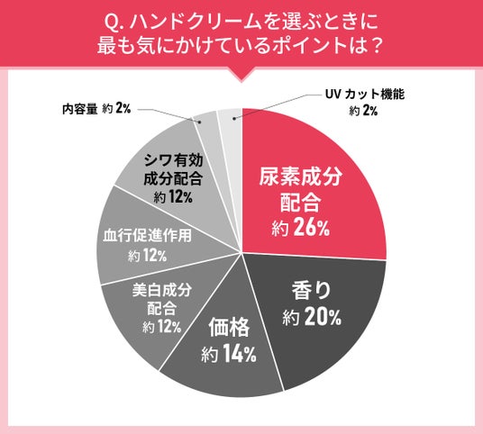 最も多かったのは「尿素成分配合」の約26%。その他成分を重視している回答として、「美白成分配合」が約12%、「シワ有効成分配合」が約12%という結果になりました。また、「血行促進作用」が約12%、「UVカット機能」が約2%という回答もあり、手肌悩みのダイレクトな解決をハンドクリームに期待していることがわかります。ほか、ハンドクリームは毎日数回使用するものなので、「香り」も重視したい点、「価格」や「内容量」といったコスパを考慮したい回答も、注目したいポイントですね。