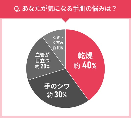「乾燥」が約40%と最も多い結果となりました。次いで「手のシワ」の約30%も比較的多い結果に。「血管が目立つ」の約20%、「シミ・くすみ」の約10%という悩みもあり、回答者はさまざまな悩みを抱えていることが分かります。