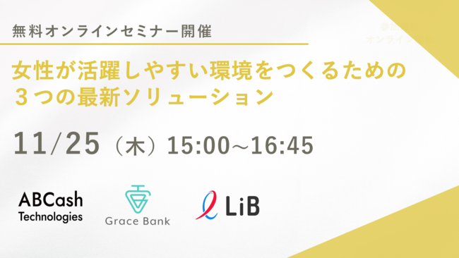 株式会社ABCash Technologies(本社:東京都渋谷区、代表取締役社長 児玉 隆洋、以下「ABCash」)、株式会社LiB(本社:東京都港区、代表取締役CEO:松本洋介、以下「LiB」、株式会社グレイスグループ(本社:東京都港区、代表取締役CEO:花田秀則、以下「グレイスグループ」)は、2021年11月25日(木)15:00~16:45に無料オンラインセミナー「女性活躍社会のための3つの最新ソリューション」を開催いたします。働く女性を支援する最新福利厚生サービスの概要を一度に知ることのできるイベントです。