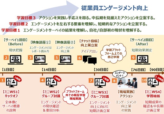 参加者は、本プログラムを通じて、エンゲージメントの重要性を理解し、それを向上するための短期・中長期それぞれの取組みを日々の仕事をしながら意識的に取り組むことで、自分のみならず組織全体のエンゲージメント向上に寄与することを狙ったプログラムです。