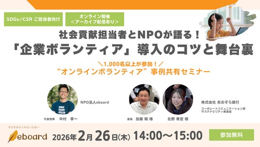 「学びをあきらめない社会」をミッションに活動するNPO法人eboard(イーボード)は、2026年2月26日(木)、株式会社あおぞら銀行のサステナビリティ推進室担当者をゲストに迎え、「企業ボランティア」導入のコツと舞台裏をお聞きするオンラインセミナーを開催します。