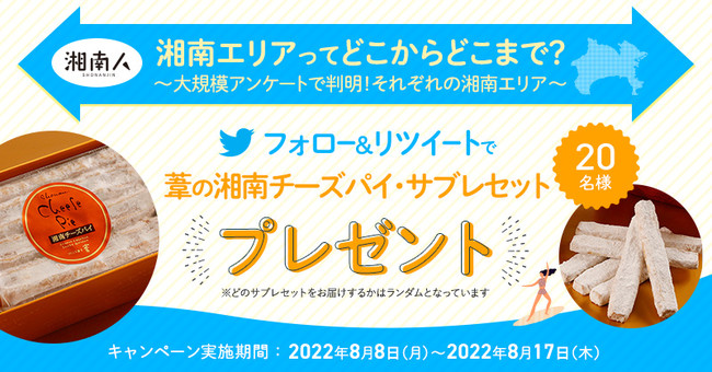 株式会社ジーン(本社:東京、代表取締役社長:林田洋明)が運営するメディア「湘南人( https://shonanjin.com/ )」は「湘南エリアアンケート」を実施しました。アンケート結果発表に伴い、「湘南クリエイティブガトー 葦」の湘南チーズパイ・サブレセットが当たるプレゼントキャンペーンを開催します。期間は2022年8月8日(月)から、2022年8月17日(木)正午まで。