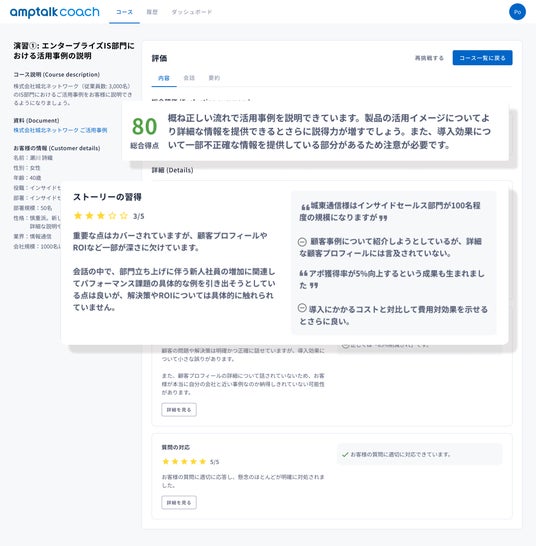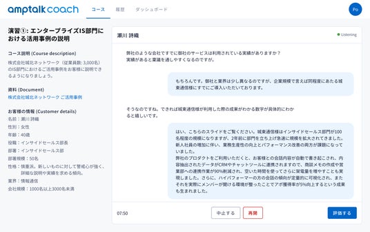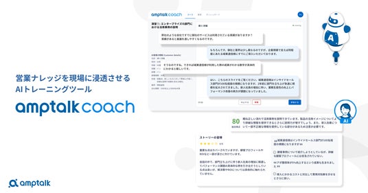 「amptalk coach」は、AIが営業資料や顧客事例等の営業コンテンツを学習し、営業と商談ロールプレイングを行う。AIによる評価とフィードバックに基づき、全ての営業が自立して学習・実践し、知識を効果的に獲得・定着させることが可能に。