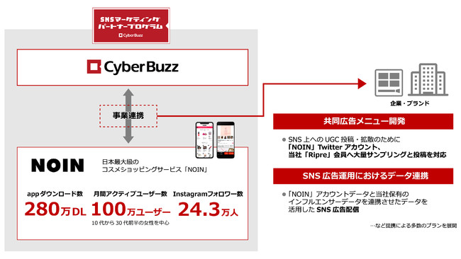 ソーシャルメディアマーケティング事業を展開する株式会社サイバー・バズ(本社:東京都渋谷区、代表取締役社長:高村彰典)は、新たに「SNSマーケティングパートナープログラム」を始動し、第1弾として日本最大級のコスメショッピングサービス「NOIN」を運営するノイン株式会社(本社:東京都渋谷区、代表取締役CEO:渡部賢)と連携開始いたします。