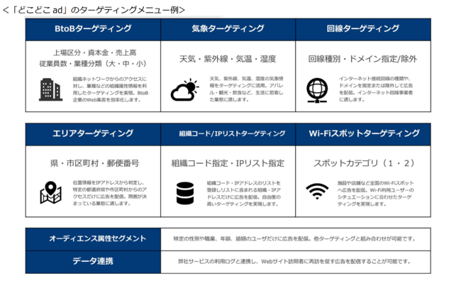 当社は、国内全てのIPアドレスに対し、100種類以上の情報を付与したIP Geolocationという独自の技術とデータベースを保有しております。「どこどこad」では、このIP GeolocationをコアテクノロジーとしたIPアドレスによるターゲティングを可能としており、Webサイト訪問者のIPアドレスから「組織」「気象」「回線種別」「エリア」「オーディエンス属性(性別、職業)」などを判定し広告を配信いたします。IPアドレスを利用するため、Cookieを拒否しているユーザなど、証跡が残らずに情報が蓄積されていないユーザに対してもターゲティングが可能です。