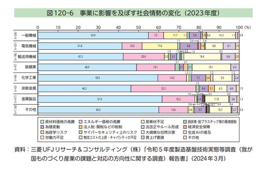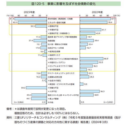 事業に影響を及ぼす社会情勢の変化に関する調査によると、2023年度は「原材料価格(資源価格)の高騰」を挙げる製造事業者は91.9%で、昨年度までに引き続き高い水準となりました。また、製造業における全ての業種において「原材料価格(資源価格)の高騰」が最も高い割合となりました。