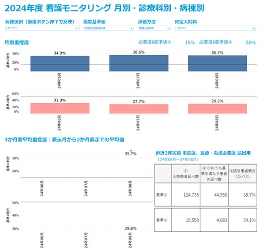 病院ダッシュボードχ(カイ)」が、軽症・中等症の高齢救急患者の受け入れなどが目的の新制度「地域包括医療病棟」に対応します。施設基準の一つである重症患者割合や緊急搬送割合、地域包括医療病棟の病床運用状況などを可視化。地域包括医療病棟を導入していない病院が、導入の効果を自病院の実際のデータを用いて試算することもできます。