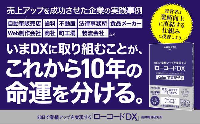 本書では、実際にローコード・ノーコードのツール「Zoho」を導入して、業績向上を実現した中小企業の事例が多数掲載されています。