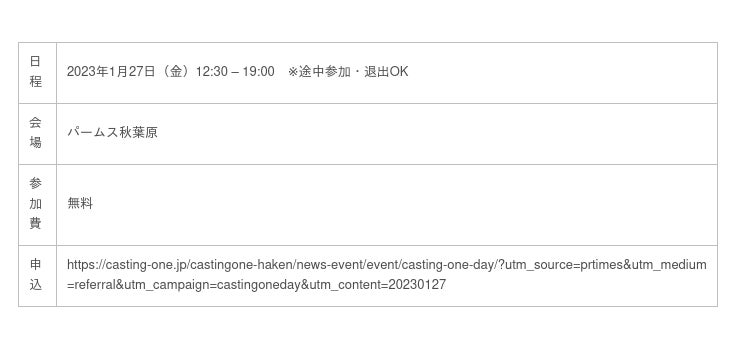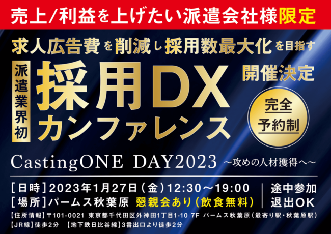 株式会社CastingONE(キャスティングワン、本社:東京都渋谷区、代表取締役:野澤 怜司)は、2023年1月27日(金)にオフラインイベント「CastingONE DAY2023」を秋葉原で開催いたします。