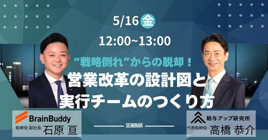「一人でも多く、パフォーマンスを発揮できる機会を提供する」をミッションに掲げ、営業支援を中心とした事業を手がける株式会社ブレーンバディ(本社:東京都港区、代表取締役:大矢剛大、以下ブレーンバディ)は、業務提携を結んだ給与アップ研究所と「営業改革の設計図と実行チームのつくり方」と題し、セミナーを共催いたしました。セミナーレポートとして、当日取り上げた内容を一部お届けします。