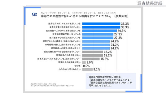 給与アップ研究所が中小企業の営業管理職101名に調査を行ったところ、営業活動における生産性向上が課題となっている企業が多いことがわかりました。解決を妨げている要因の一部を、以下に記載します。