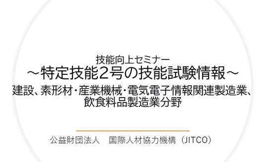 公益財団法人 国際人材協力機構(JITCO、理事長:八木 宏幸)は7月30日(火)に、6月26日(水)に開催した「技能向上セミナー~特定技能2号の試験情報(建設、素形材・産業機械・電気電子情報関連製造業、飲食料品製造業)~」の録画配信ウェビナーを開催します。