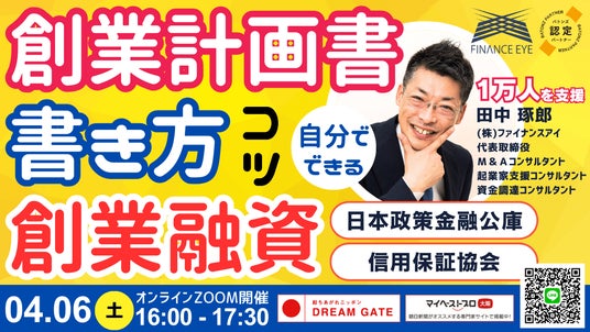 「エステ・ネイル・サロン・美容系ビジネスで起業するなら日本政策金融公庫の新創業融資がオススメ!4月1日融資制度拡充版に対応。創業計画書の書き方。~女性起業家を含め1万件以上を支援したファイナンスアイ田中琢郎社長が直伝」と題したこのセミナーでは、田中社長自らが、1万人以上の起業家や経営者の融資を支援した実体験をもとに、創業期の有力な資金調達手段である創業融資を成功させる創業計画書の書き方を分かりやすくお伝えします。本セミナーは、2024年4月13日(土)16:00より、オンラインでZOOMを使用して実施されます。