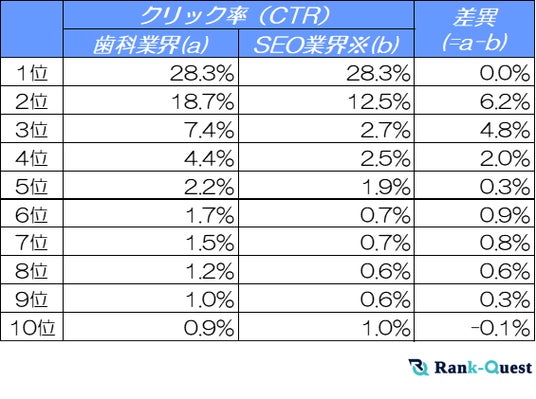 さらに、ランクエストサイト(SEO業界)におけるクリック率データとも比較し、歯科サイトならではのクリック傾向を検証しました。