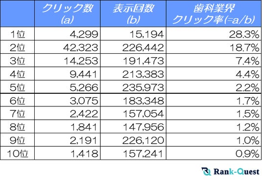 https://rank-quest.jp/column/column/how-to-seo/ SEO支援実績4,300社ランクエスト:歯科業界1位~10位の検索順位別CTRデータを解説