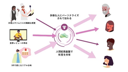 本技術は、味覚に関するデータを把握する機器(センシングデバイス)、味覚の感度に対する個人差を推定し共有する「人間拡張基盤」と、味覚を再現する駆動機器(アクチュエーションデバイス)の3つで構成し実現するものです。
