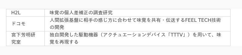H2L株式会社(以下、H2L)、株式会社NTTドコモ(以下、ドコモ)、明治大学総合数理学部 宮下芳明研究室(以下、宮下芳明研究室)は、ドコモが開発した「人間拡張基盤(R) ※1」と、宮下芳明研究室とH2Lが研究開発した味覚を再現する技術を連携し、相手の感じ方に合わせた味覚を共有する技術(以下、本技術)を開発しました。相手の感じ方に合わせた味覚を共有する基盤技術の開発は世界初 ※2 となります。