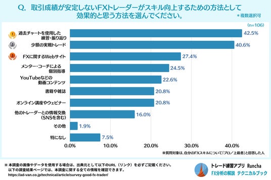 1位は「過去チャートを使用した練習・振り返り」で42.5%、2位が「少額の実戦トレード」で40.6%となりました。3位は「FXに関するWebサイト」の27.4%で、2位と差が大きく開いています。FX上級者はスキル向上において、特に上位2つを重視していることがうかがえます。