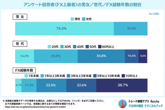 有効回答数は106名で、回答者の男女/世代/FX経験年数の割合は、以下の通りです。