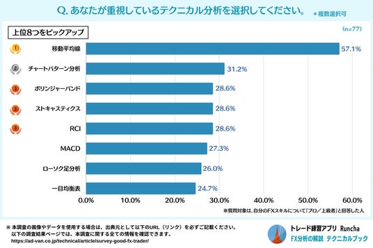 「テクニカル分析」と回答した人を対象に、具体的に何を重視しているかについても質問を行いました。次のグラフは、上位8つの結果をピックアップしたものです。
