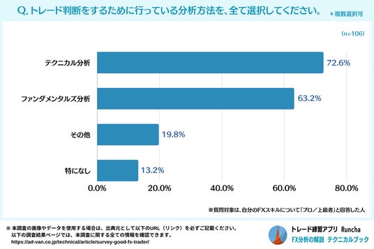 3.テクニカル分析を重視している人が72.6%、人気は移動平均線で57.1%が重視相場を分析する代表的な方法としては、大きくテクニカル分析とファンダメンタルズ分析の2つが挙げられます。FX上級者はどちらを重視しているのかを調査するために、トレード判断をするために行っている分析方法について質問しました。