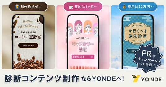 株式会社YONDE(本社:福岡県福岡市中央区、代表取締役:田坂 洋一、以下「YONDE」)は、診断コンテンツ制作とSNSシェアを組み合わせたキャンペーンを一体的に支援する「診断キャンペーンプラン」の提供を開始しました。