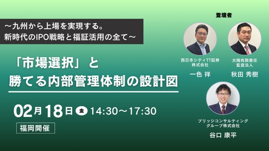 九州企業のプレゼンスを日本全土、ひいては世界へ高めるべく、 この度、西日本シティTT証券株式会社、太陽有限責任監査法人、ブリッジコンサルティンググループ株式会社の3社は、福岡・天神にて、IPO(新規上場)を目指す経営者・監査役・CFO(管理部門中核メンバー)を対象とした共催セミナーを開催いたします。