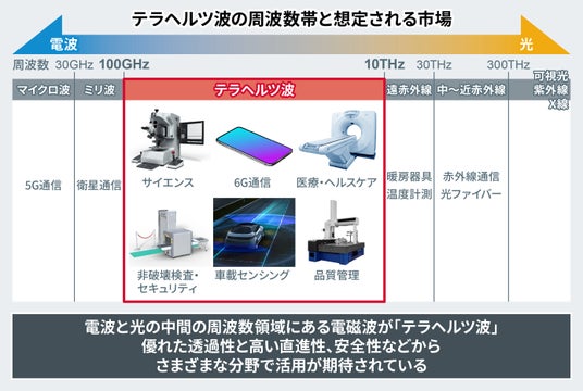 電波と光の中間の周波数領域に位置する電磁波「テラヘルツ波」は、電波のような優れた透過性とレーザー光線のような直進性、高分子材料などに対する特有の吸収特性などのさまざまな特性を持つことから、放射線を使わない人体、物質の非破壊検査や従来の無線通信に代わる高速通信、高精細なレーダーセンシングなどへの活用が期待されています。一方で、従来の方式では装置のサイズが大きく、導入コストも数百万円~数千万円以上と高額だったため、民間企業による研究や事業化は難しいのが実情でした。