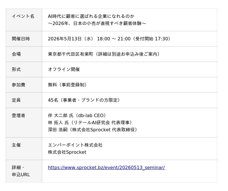 生成AIが普及し、テクノロジーが最適解を提示する時代において、企業はどのようにして顧客から選ばれ続ける存在になれるのでしょうか。2026年、日本の小売・EC業界は「AI活用の実装」と「顧客体験(CX)の再定義」という大きな転換点に立っています。この度、株式会社Sprocket(本社:東京都品川区、代表取締役:深田 浩嗣、以下「Sprocket」)とマーケティングプラットフォームを提供するエンバーポイント株式会社(本社:東京都千代田区、代表取締役:五十嵐 真人、以下「エンバーポイント」)は、業界や企業の垣根を越えたマーケター同士の情報交換とネットワーク構築を目的とした、招待制のオフラインイベントを開催いたします。特別ゲストに、リテールAI活用の第一人者である林拓人氏と、CX設計の実践者である伴大二郎氏をお迎えし、AI活用のリアルや戦略的な顧客体験戦略についてのトークセッションもおこないます。