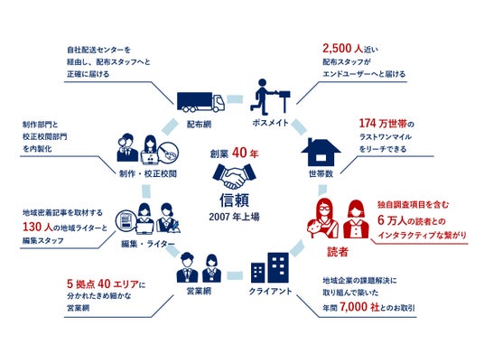 当社は、地域密着型の生活情報誌『ちいき新聞』の発行を軸に、情報発信および販売促進の総合支援事業を展開しており、年間約7,000社にサービスを提供しています。千葉県を中心に毎週発行している『ちいき新聞』は、専属の配布員により174万世帯へポスティングされ、創業以来40年以上にわたり配布を継続してきたことで、他に類を見ない9つのアセットを築いてきました。
