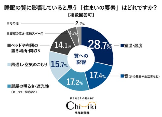 「睡眠の質に影響していると思う『住まいの要素』はどれですか?」という質問の回答で最も多かったのは「室温・温度」で28.7%。以下、僅差で「音」、「部屋の明るさ」、「風通し」、「ベッドや布団の置き場所」と続きます。