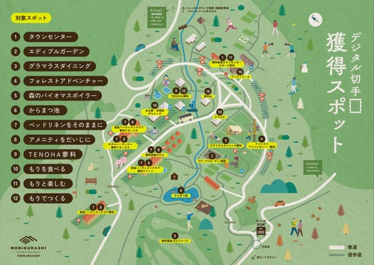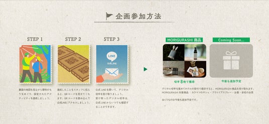 タウン内滞在を楽しむ中で、各所に設置されているQRコードを読み取ることで、デジタル切手を集めることができます。デジタル切手を一定の枚数集めることで、もりの恵みから生まれた、MORIGURASHI商品を受け取ることができます。
