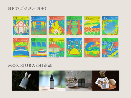 (上)各スポットで獲得できるデジタル切手は全12種と、(下)特典として受け取れるMORIGURASHI商品。