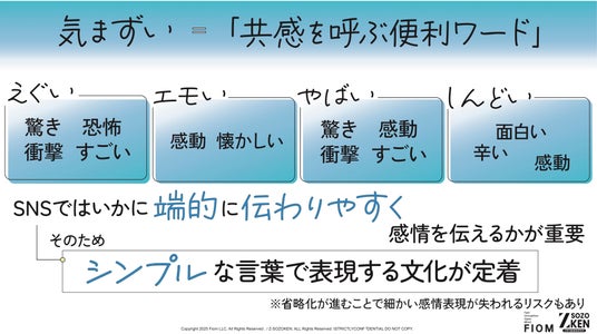 「えぐい」「しんどい」「草」など、若者の間で流行する言葉には「短く、汎用性が高い」という共通点があります。 本スライドでは、「気まずい」もまた、そうした「共感を呼ぶ便利ワード」の系譜にあることを示しています。SNS上では、長文で感情を説明するよりも、短い言葉で「感情のタグ付け」をする方が、タイムラインの流れを止めずにスムーズに共感を得られます。Z世代にとって「気まずい」は、ネガティブな状況を一瞬で共有するための最適なパッケージ言語として機能しています。