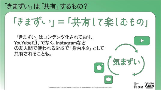 Z世代に特化したクリエイティブカンパニーFiom合同会社(本社:東京都渋谷区、代表社員:竹下洋平)が運営しているZ世代の実態や価値観を分析するシンクタンク、Z-SOZOKEN(Z世代創造性研究所)は、Z-SOZOKEN THINKTANK 最新調査研究レポートの第二弾として『Z世代の気まずいの感覚』についての調査研究レポートの第8章インサイトサマリー「気まずい is 共感を呼ぶ便利ワード」をリリースしました。