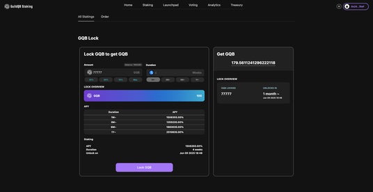 「ロック付きステーキング」はGQBトークンを一定期間ロック(引き出し制限)することで、通常のステーキングよりも高いリワードや特別なインセンティブを受け取れる仕組みです。