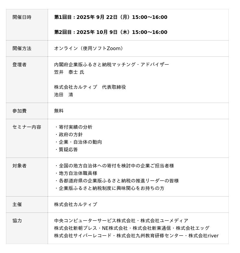 企業版ふるさと納税を活用した地域課題解決プラットフォーム「river(リバー)」を運営する株式会社カルティブ(本社:神奈川県横浜市、代表取締役:池田 清)はこの度、2025年8月下旬に発表された企業版ふるさと納税の寄付実績をもとにしたセミナーを2025年9月22日(月)、2025年10月9日(木)に開催いたします。