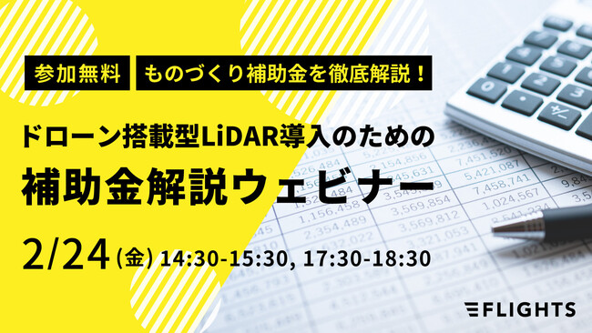 株式会社FLIGHTS(本社:東京都渋谷区、代表取締役:峠下周平 以下:FLIGHTS)は、2023年2月24日(金)14:30~15:30/17:30~18:30より『ドローン搭載型LiDAR導入のための補助金解説ウェビナー』を開催いたします。同日2回開催、いずれも同じ内容となります。