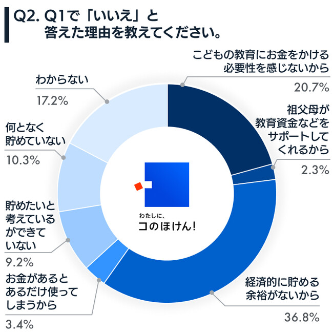最多は「経済的に貯める余裕がないから」36.8%でしたが、次点で「こどもの教育にお金をかける必要性を感じないから」20.7%と考えられている方も少なくないことがわかりました。