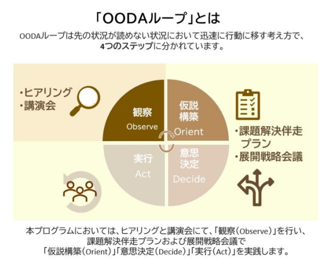 「OODAループ」のアプローチを用います。これは先の状況が読めない環境 下において迅速に行動に移す考え方で、
