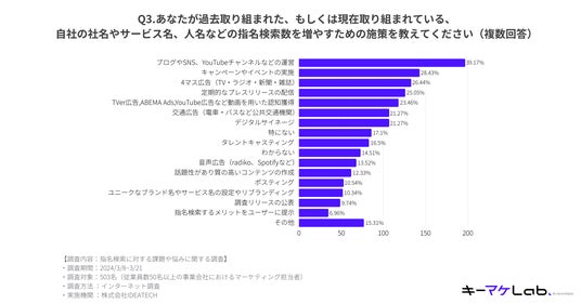 ■過去もしくは現在、指名検索数増加のために取り組んでいることは「ブログやSNS、YouTubeチャンネルなどの運営」が39.17%で最多過去取り組んだもしくは現在取り組んでいる、指名検索数を増やすための施策は、39.17%が「ブログやSNS、YouTubeチャンネルなどの運営」、28.43%が「キャンペーンやイベントの実施」、26.44%が「4マス広告(TV・ラジオ・新聞・雑誌)」と回答。