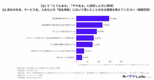 課題を感じたことが「とてもある」「ややある」と回答した方に、具体的に課題だと感じる点を聞いたところ、55.06%が「指名検索数を増やせていない」、43.82%が「指名検索時に競合他社の広告が表示される」、34.46%が「サジェスト汚染が起きている」と回答しました。