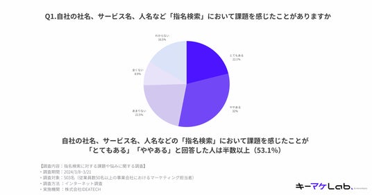 調査結果の詳細■指名検索に関して課題を感じたことが「とてもある」「ややある」と回答した方が53.1%調査によると、自社の社名やサービス名、人名などの指名検索において課題を感じたことが「とてもある」「ややある」と回答した人が53.1%という結果に。