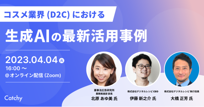 GPTシリーズを活用した日本最大級のAIコピーライティングツール「Catchy(キャッチー)」を運営するテクノロジー企業の株式会社デジタルレシピ(本社:東京都渋谷区、代表取締役:伊藤新之介)が、薬機法の広告コンサル領域で圧倒的な実績を持つ、DCアーキテクト株式会社(本社:東京都中央区、代表取締役 鈴木幸治)運営の薬事法広告研究所との共催により、Generative AIおよびコスメ業界企業におけるGenerative AI活用方法の最新事例をご紹介するセミナーを2023年4月4日(火)16:00~16:45に開催いたします。