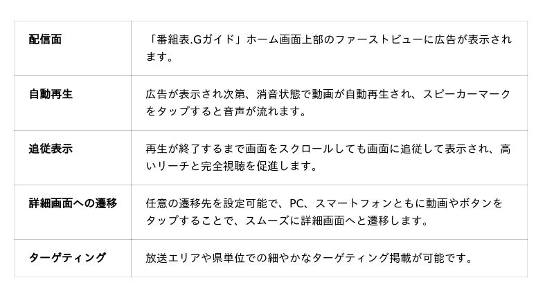 株式会社IPG株式会社IPG(本社:港区、代表取締役社長:岡本賢人、以下「IPG」)は、2025年9月より、ウェブブラウザ版の電子番組表サービス「番組表.Gガイド」のホーム画面の最も視認性の高い上部エリアに、新たに動画広告を掲載する機能「TopVideo」を実装しました。